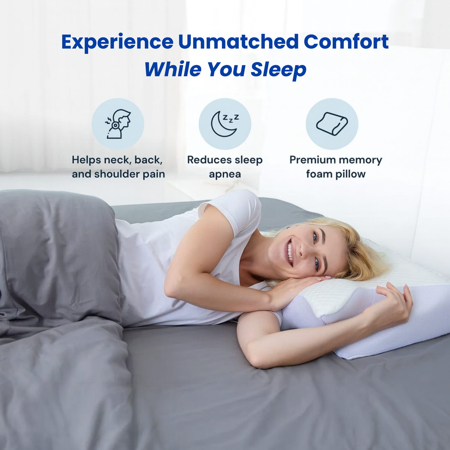 Our SomaSleep™ DeepRest Pillow gently cradles your head and neck to keep you naturally aligned, relax tense muscles, and encourage smoother breathing—so you can fall asleep faster and wake up clear-headed, pain-free, and fully recharged.