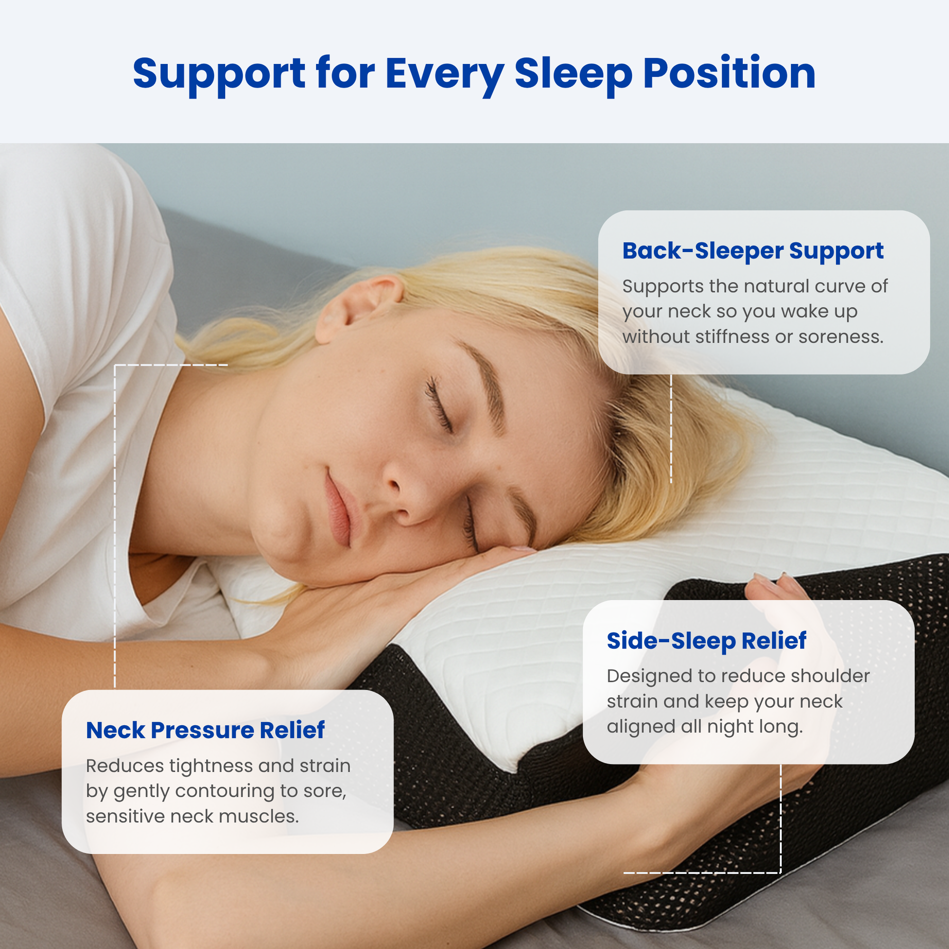 Yes — the contoured design reduces discomfort, keeps your head in a stable position, and prevents the “constant readjusting” that disrupts deep sleep. Many users report feeling more relaxed, falling asleep faster, and waking up less during the night.