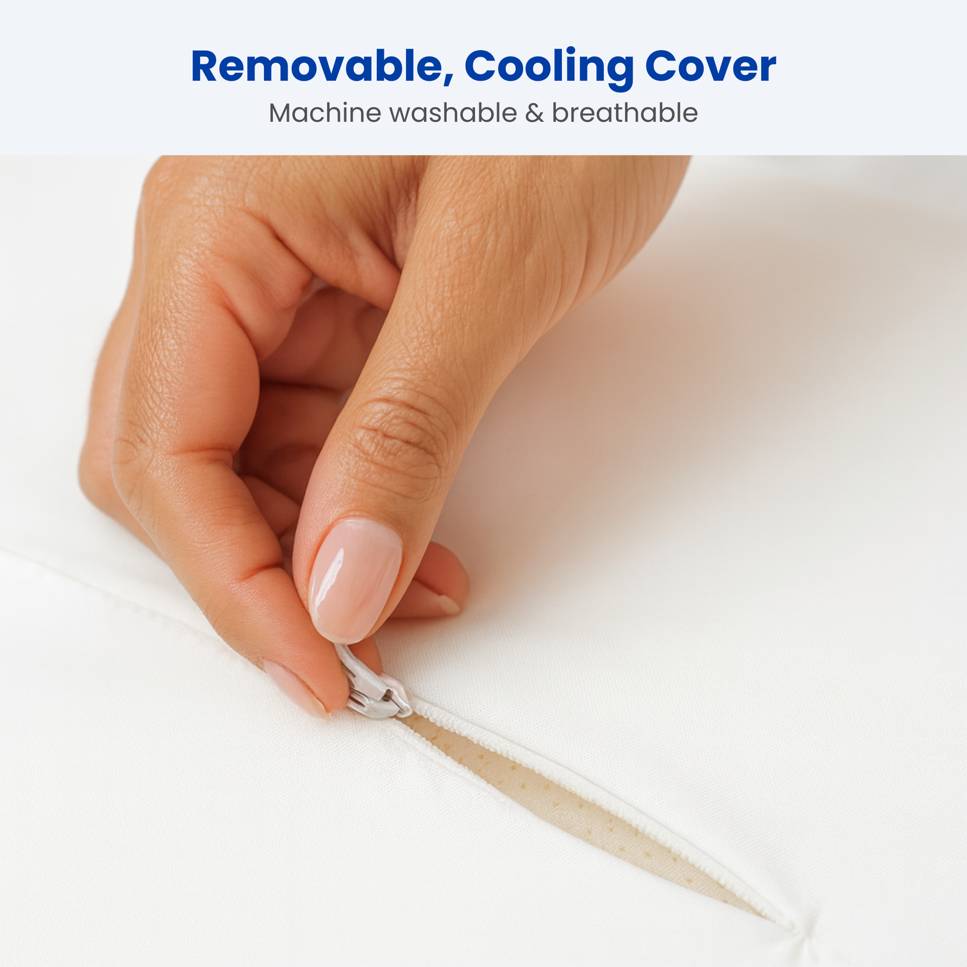 The pillow is made from premium adaptive memory foam that molds to your shape while still offering firm support. The outer cover is soft, breathable, and washable — keeping you cool and comfortable through the night.